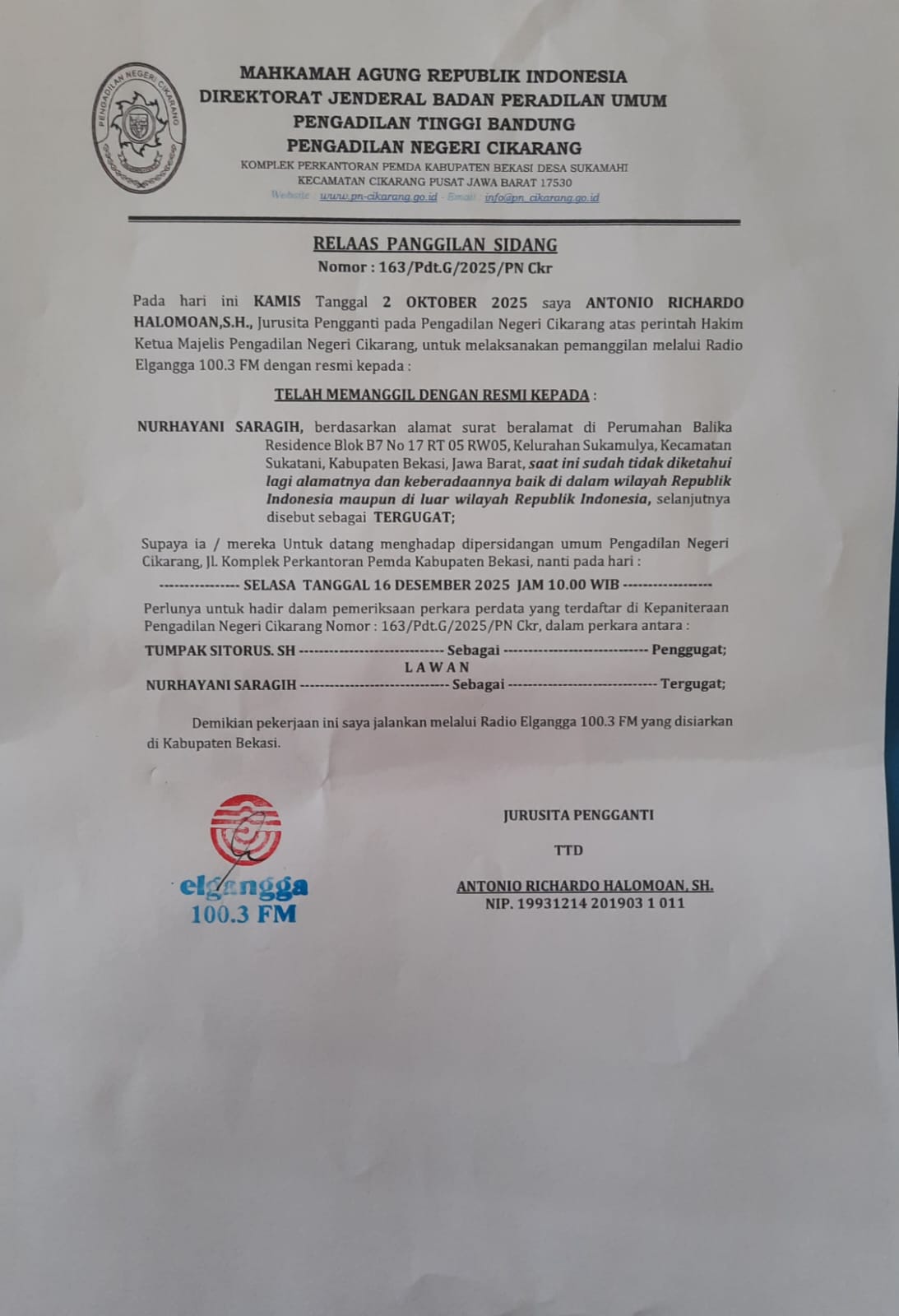 Panggilan Kepada Pihak yang tidak diketahui alamatnya15 Oktober 2025