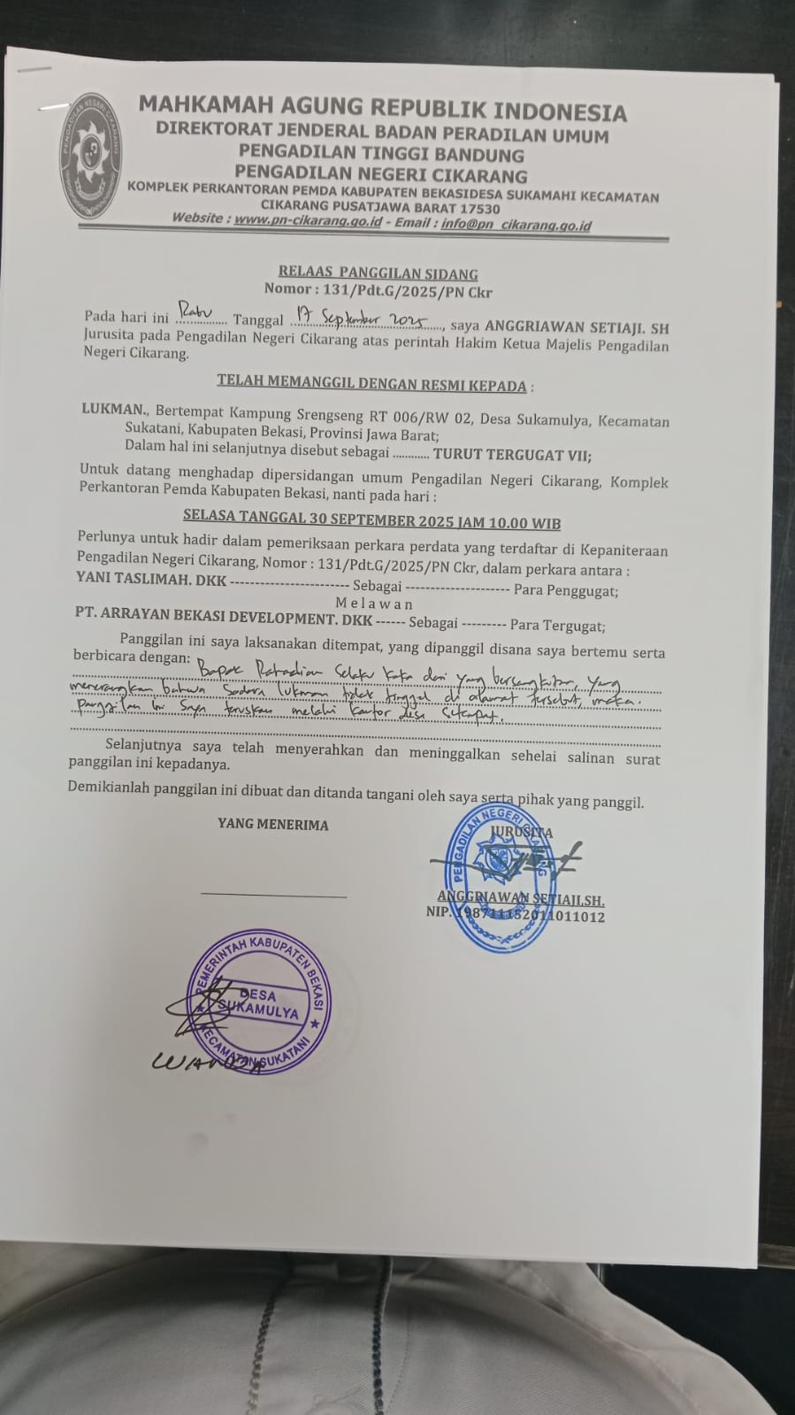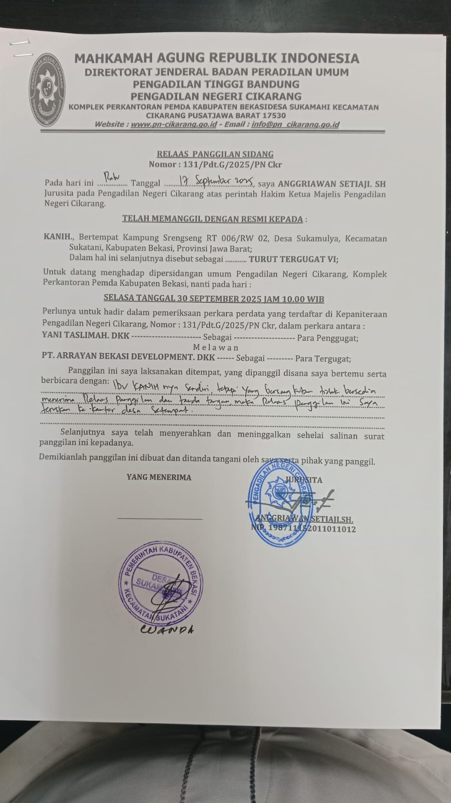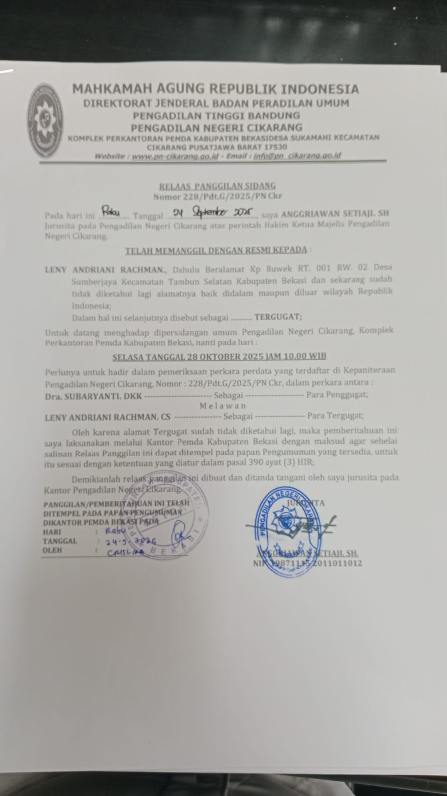 Informasi dan pengumuman resmi dari Pengadilan Negeri Cikarang
